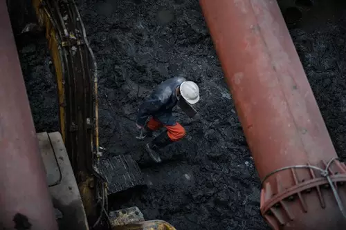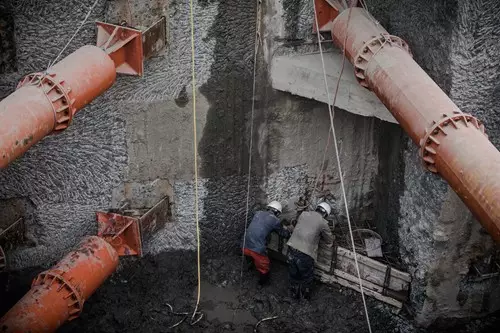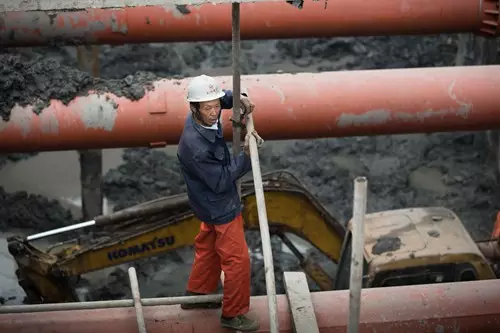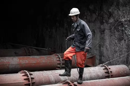 陳老頭穿著套鞋走在泥濘的地下工地。