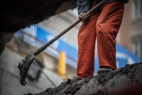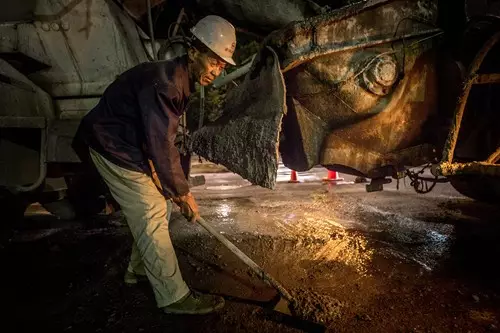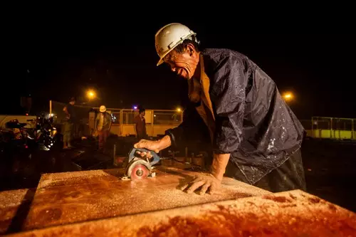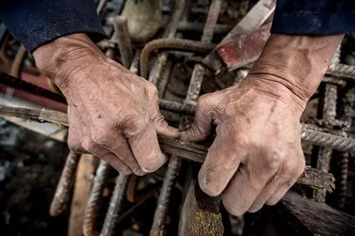 陳老頭正在為澆筑混凝土做準(zhǔn)備,他的雙手布滿了青筋和老繭。
