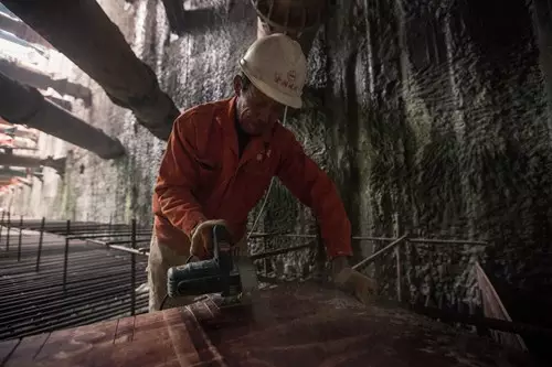 陳老頭正在地下工地搭建腳手架。