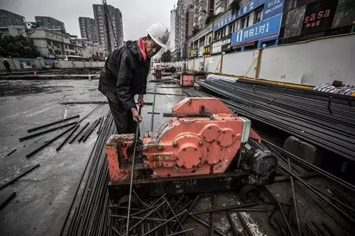 雨中,陳老頭正在截鋼筋。