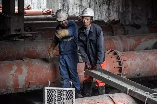 陳老頭手里拎著焊槍走在懸空的管道上。