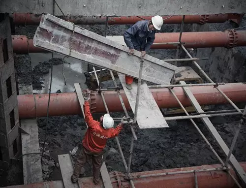 陳老頭正在和工友配合著放木板。