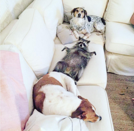 1.南瓜這只浣熊被救助以后,同家里的兩只狗同吃同住,已經(jīng)忘了自己的浣熊身份~