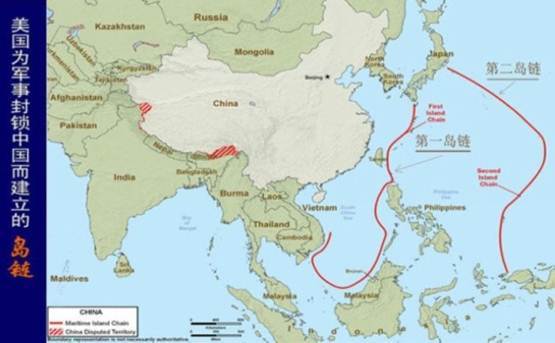美國(guó)是世界上唯一的超級(jí)大國(guó),其利益遍及天下。亞太地區(qū)作為當(dāng)今世界上經(jīng)濟(jì)最活躍的地區(qū),美國(guó)存在于此的利益也是巨大的。為維護(hù)其利益,美國(guó)在亞太地區(qū)建立了一系列的軍事基地,形成了許多盟國(guó)。形成了北起阿拉斯加、阿留申群島經(jīng)日、韓、臺(tái)灣至東南亞的勢(shì)力圈,旨在對(duì)中國(guó)和俄羅斯進(jìn)行海上封鎖的第一島鏈。第一島鏈?zhǔn)敲绹?guó)軍事力量在亞太地區(qū)的最前端,是其島鏈中布置最嚴(yán)密、軍事力量最強(qiáng)大的一條。因此美國(guó)對(duì)亞太地區(qū)的戰(zhàn)略格局有著關(guān)鍵性的影響。因?yàn)橹袊?guó)的出??诰谖覈?guó)東部,均直接面臨第一島鏈,這一島鏈將中國(guó)封鎖在內(nèi)海上,進(jìn)出太平洋都是相當(dāng)困難的。